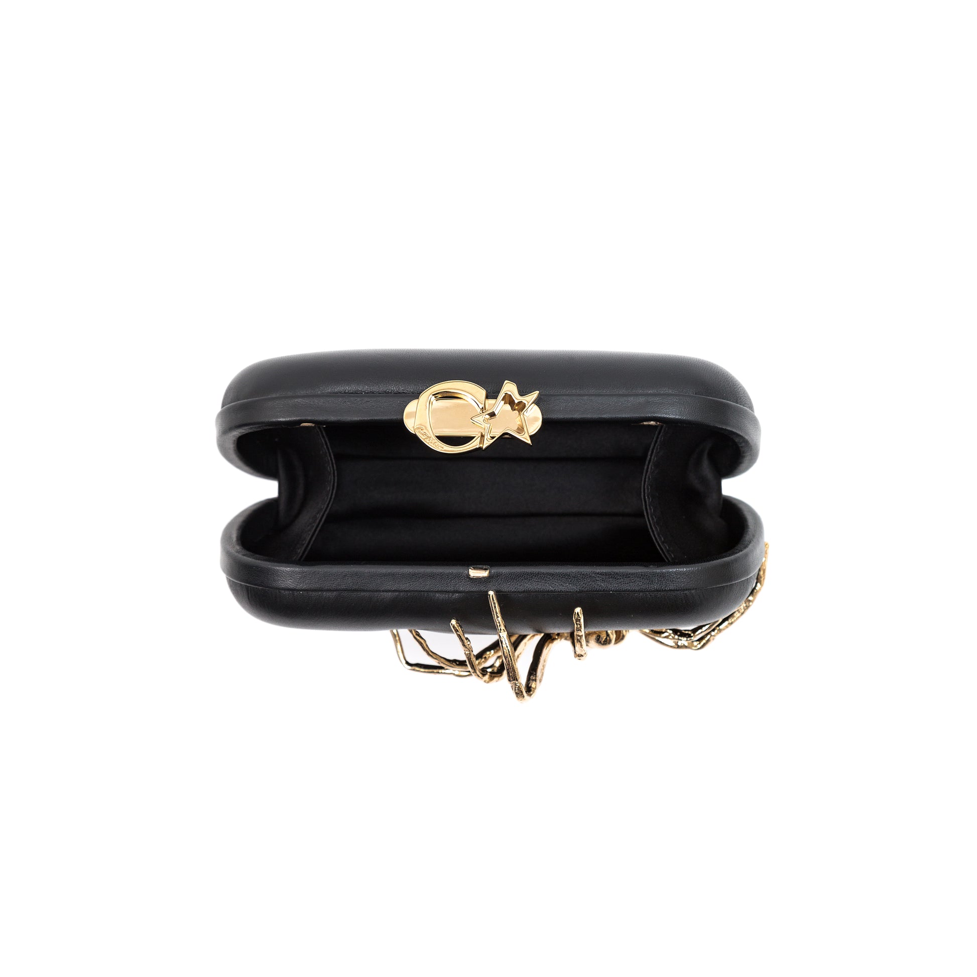 La pochette Susan C Star Tarantula è completamente realizzata a mano in pelle di vitello conciata in una finitura nera liscia. Il design classico della borsa è ingioiellato con una pericolosa tarantola, le cui gambe strisciano delicatamente su un lato della frizione. Tutto l'hardware e la tarantola sono realizzati in ottone massiccio, immerso in oro 24KT, che ne esalta l'opulenza raffinata e audace.