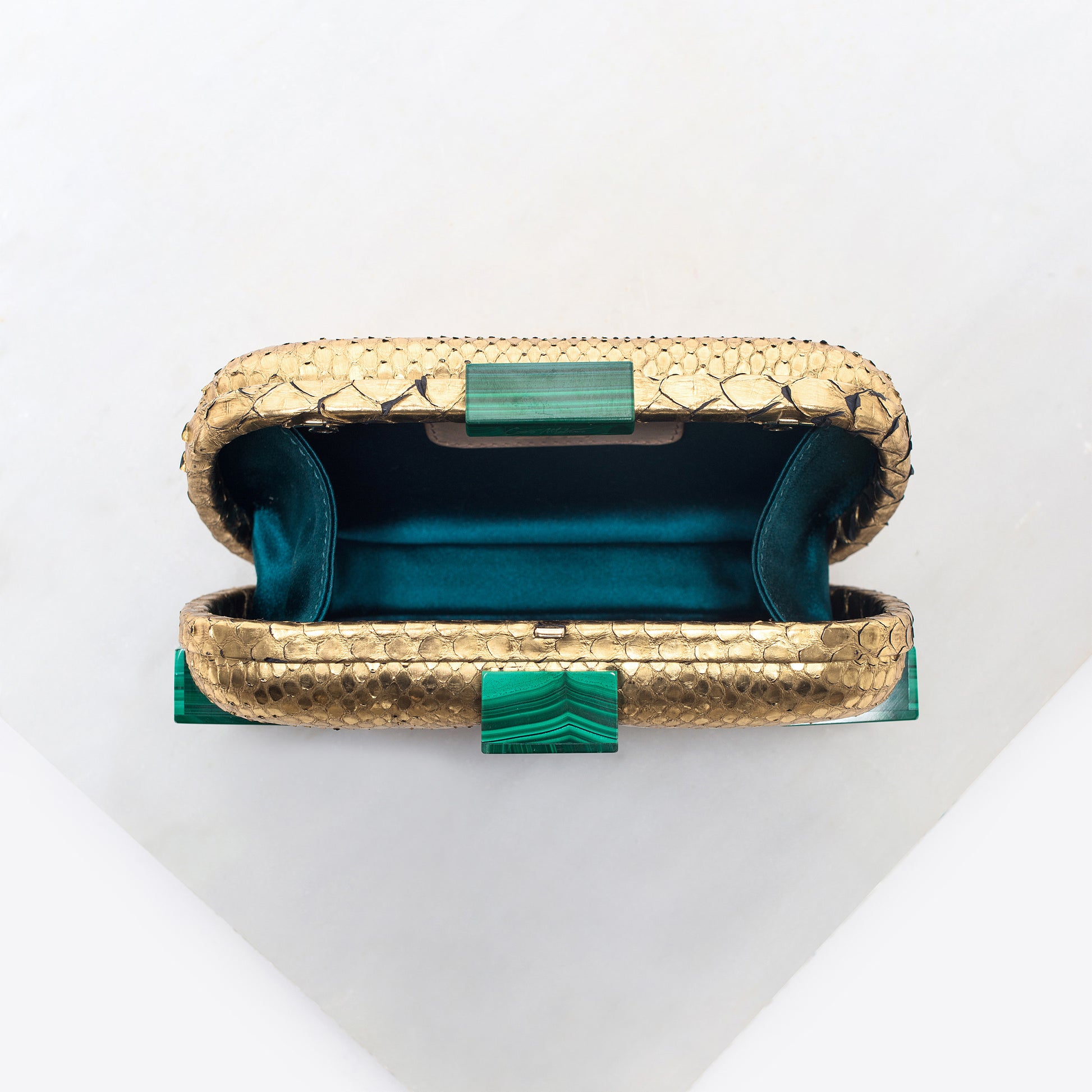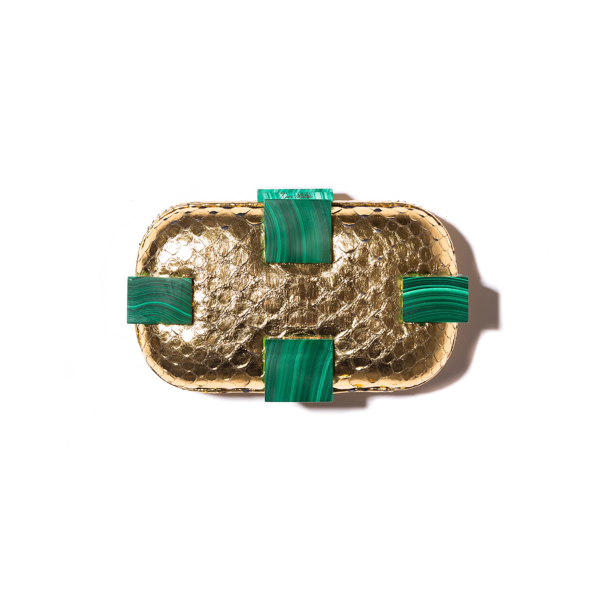 Crafted with inspiration from nature's understated elegance, the Susan Shock Gold/Malachite is expertly handcrafted using luxurious leather dipped in 24KT gold. Its timeless design is elevated with four square panels and a clasp closure featuring pure malachite, adding a stunning shock factor with this precious gemstone. Made with Snake Skin dipped in 24KT gold and adorned with Malachite accents, the bag boasts a Malachite Bar Clasp Closure and a silk-lined interior. It also comes with a leather pouch, long metal chain, short metal chain, and dust bag.