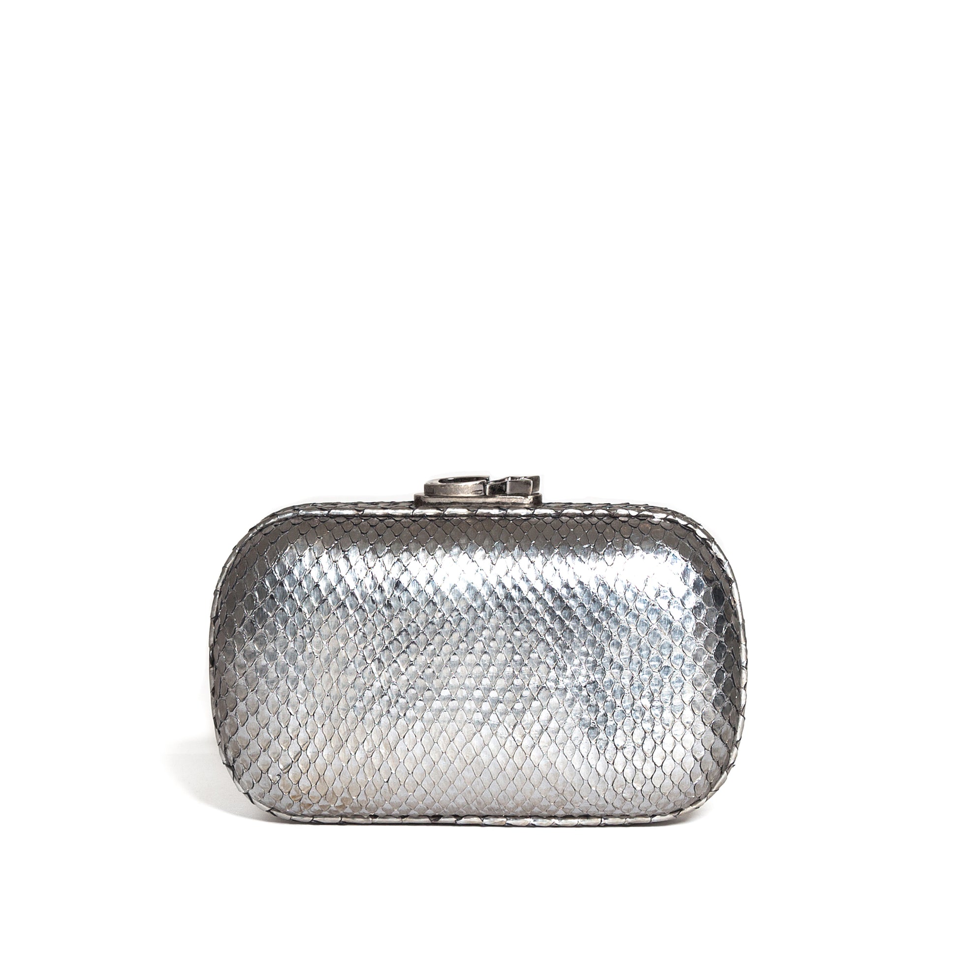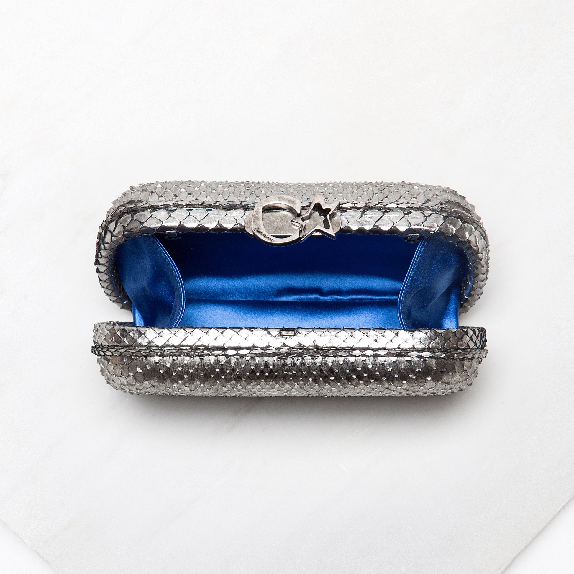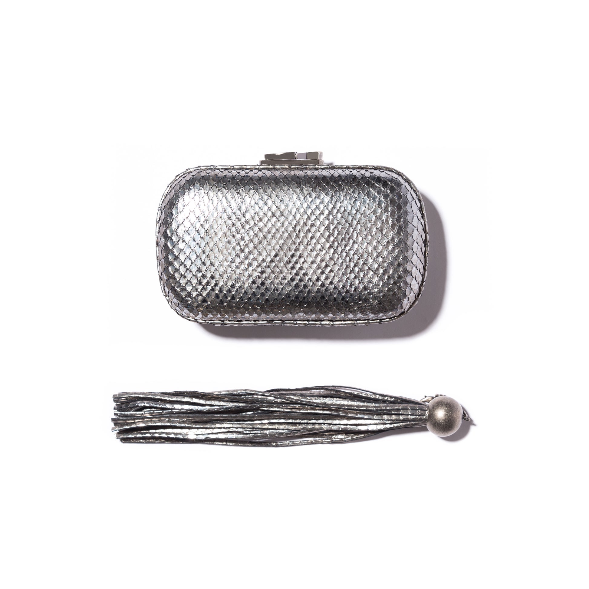 La semplice opulenza di Snakeskin è arricchita da questa clutch "Susan" intinta in argento e nappa aggiuntiva. Con la sua finitura lucente e gli interni in seta morbidi, è il perfetto tocco finale per qualsiasi outfit da sera.